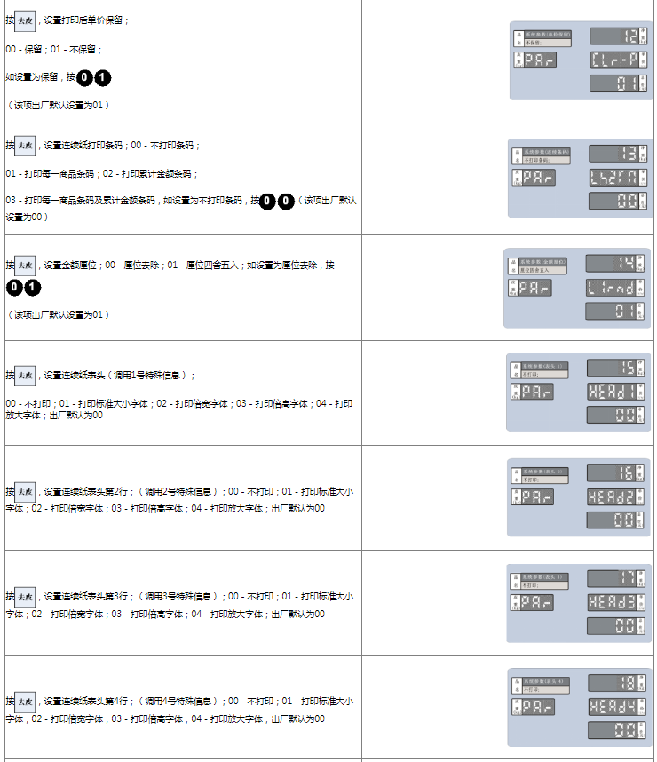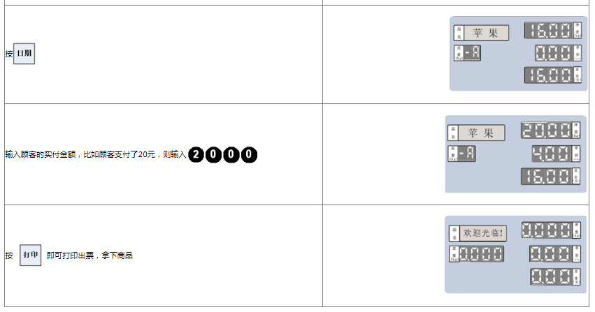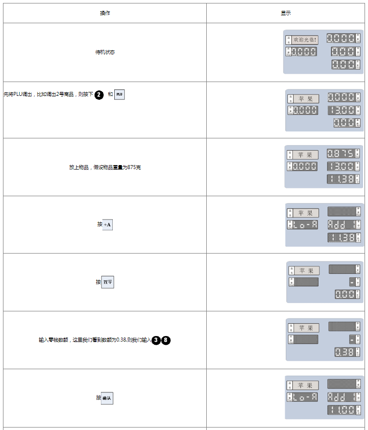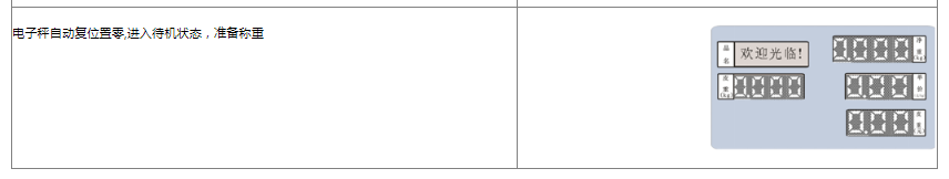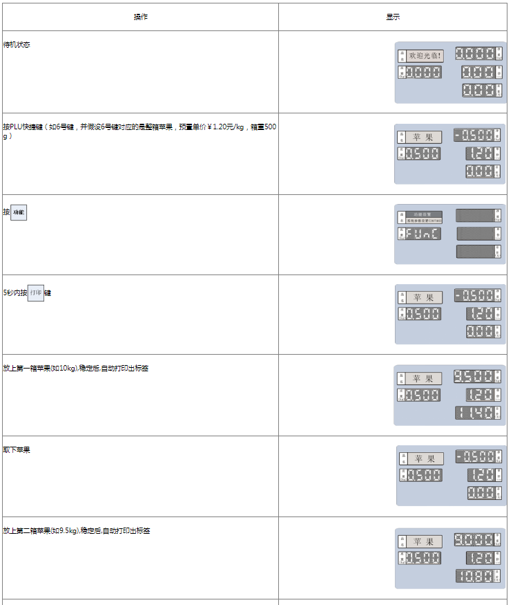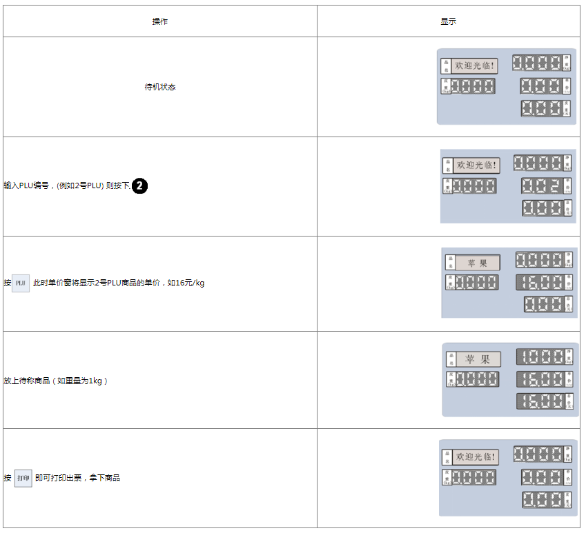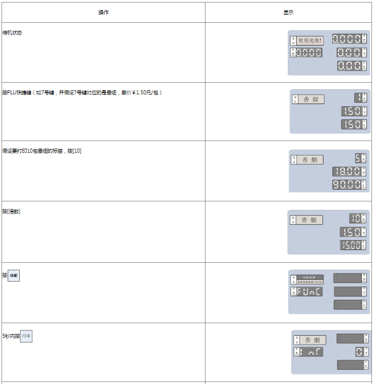 阅读本手册时,操作见表格最左列,表格其余列为实施最左列操作后条码打印计价秤各个窗口的显示内容;