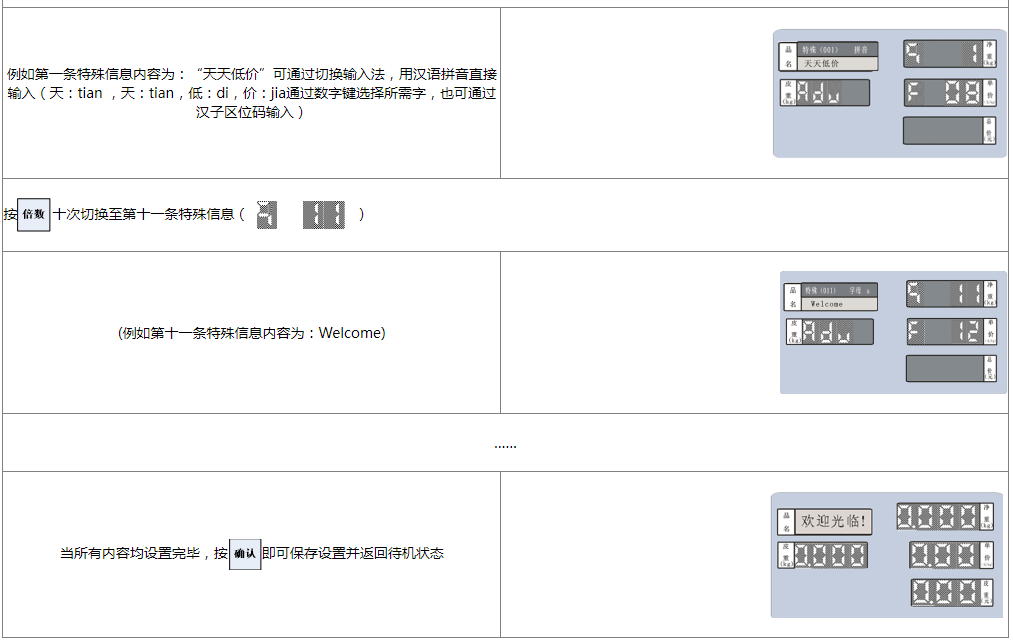本秤可设置10条汉字特殊信息(编号从1到10)及12条字符特殊信息(编号从11到22),标签纸状态下可供每条PLU信息调用其中的任意3条打印;连续纸状态下,其中的1~4号汉字特殊信息对应表头的1~4行,5~8号对应表尾的1~4行。每条汉字信息内容最多可设置30个汉字,每条字符信息内容最多可设置30个字符。特殊信息设置密码为“44444”。