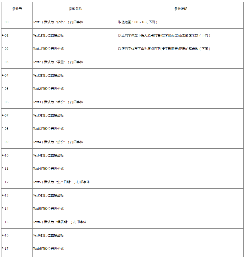 本秤可设置并存储16种标签格式,其中每种格式包含两部分设置,即:通用部分格式及Text文本格式。格式编号从0至15号;如某个PLU调用3号标签格式,即通用部分及Text文本格式编号均为3号。