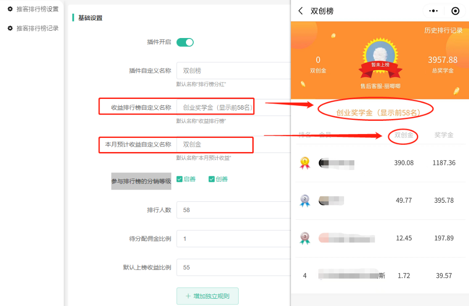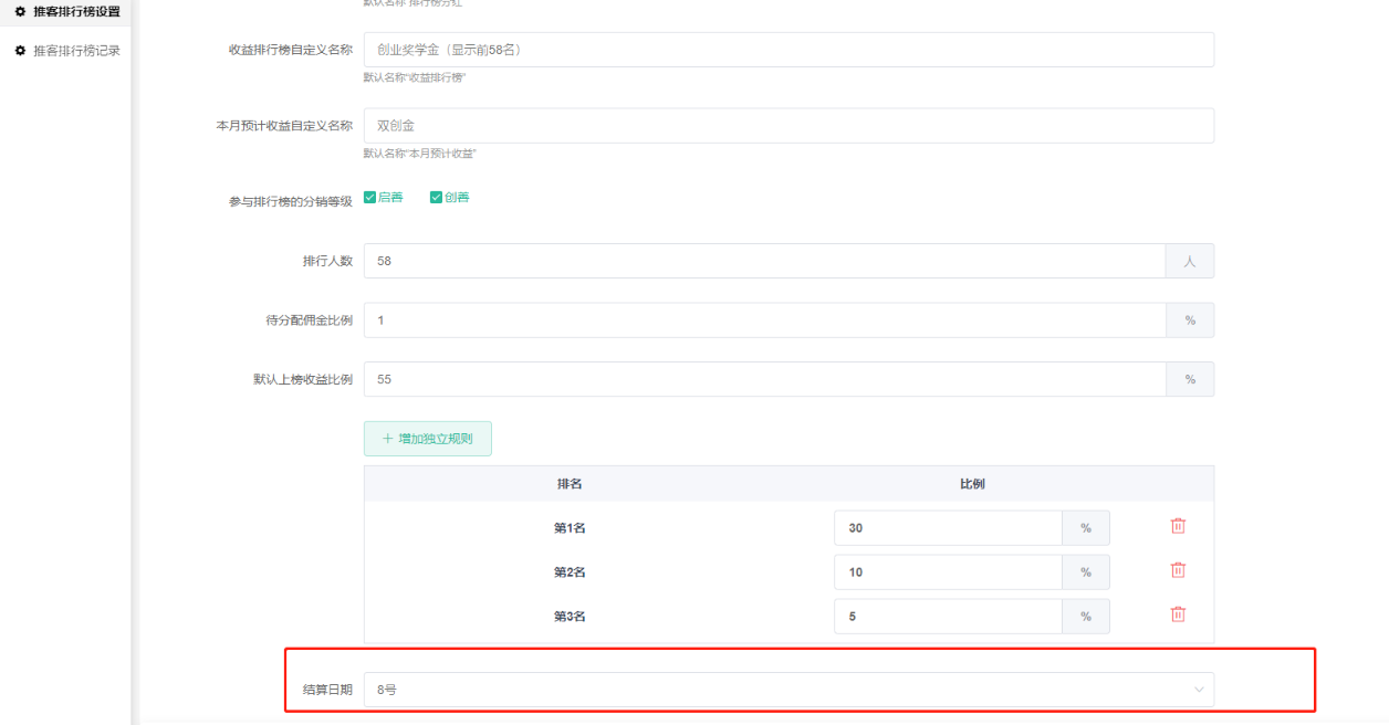 上榜的会员获得的收益比例。可以设置独立规则,第1名 第2名 第3名 第4名....(可自由增加)